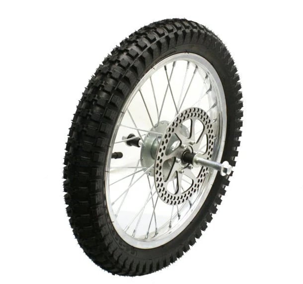 Includes 16"x2.4" knobby tire, inner tube, wire spoke wheel, disc brake rotor, and axle (not pictured), product assembly required. Note that MX500 rear wheel uses 2.50-10 tire and tube.