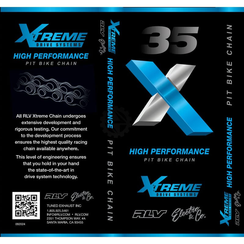 E&C worked together with RLV to bring you this Extreme High Performance Pit Bike Chain for the ETM RTR. This Chain is Pre Stretched, High Strength and Runs Smoother for Longer Than ANY Chain on the Market. This is a MUST HAVE upgrade for your ETM RTR if you shred hard. This RLV Xtreme Chain undergoes extensive development and rigorous testing. Our commitment to the development process ensures the highest quality racing chain available anywhere. This level of engineering ensures that you hold in your hand the state-of-the-art in drive system technology. 140 Link option now available for Big Wheel Kits on ETM RTR as well as for use with Razors, EBOX and Mototec #35 chain kits.
